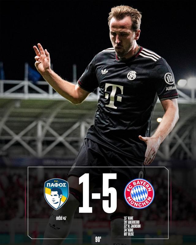 【欧冠】凯恩梅开二度,杰哥处子球,拜仁5比1帕福斯