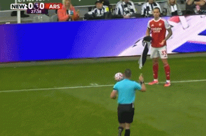阿森纳客战纽卡第28分钟,阿森纳获得前场左路边线球,卡拉菲奥里从场边捡了毛巾准备擦球,这位边后卫想掷出大力边线球。不过当值主裁吉莱特不允许这么做,他从卡拉菲奥里手上拿走毛巾,并扔至场外。