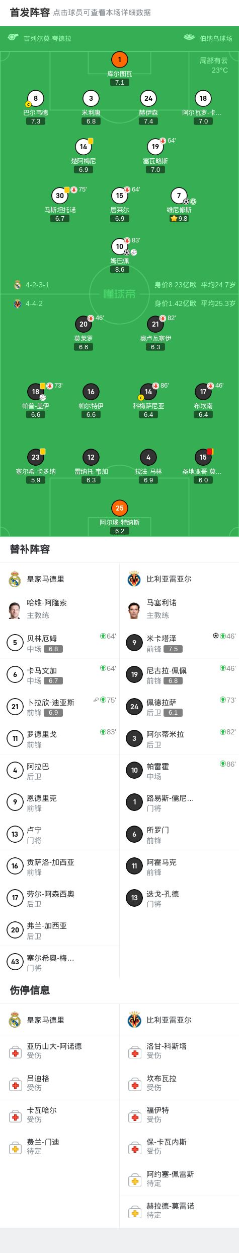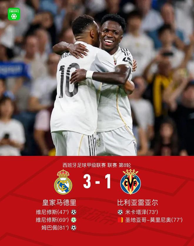 北京时间10月5日西班牙足球甲级联赛 联赛 第8轮,皇家马德里主场对阵比利亚雷亚尔。上半场,两队均无建树。下半场,维尼修斯射门折射入网。随后,巴西人造点并亲自主罚命中。维尼修斯突破被莫里尼奥拉倒,后者吃到第二张黄牌被换下。卜拉欣无私助攻,姆巴佩破门。全场比赛结束,皇马3-1战胜比利亚雷亚尔。